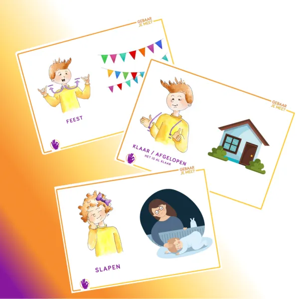 De dagritmekaarten zijn kaarten van A5 formaat met daarop aan de linkerkant de gebarentekening en aan de rechterkant de afbeelding van de activiteit. Deze kaarten kunnen gebruikt worden om het dagritme aan te geven. Doordat de afbeelding en de gebarentekening naast elkaar staan, word je uitgedaagd het gebaar te maken.